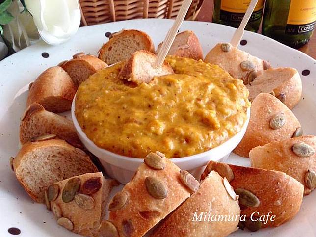 南瓜蒸熟,加入坚果和起司,慢火拌至起司融化成稠酱状,沾麵包或饼乾,当沙拉沾酱,美味满点,营养满分!