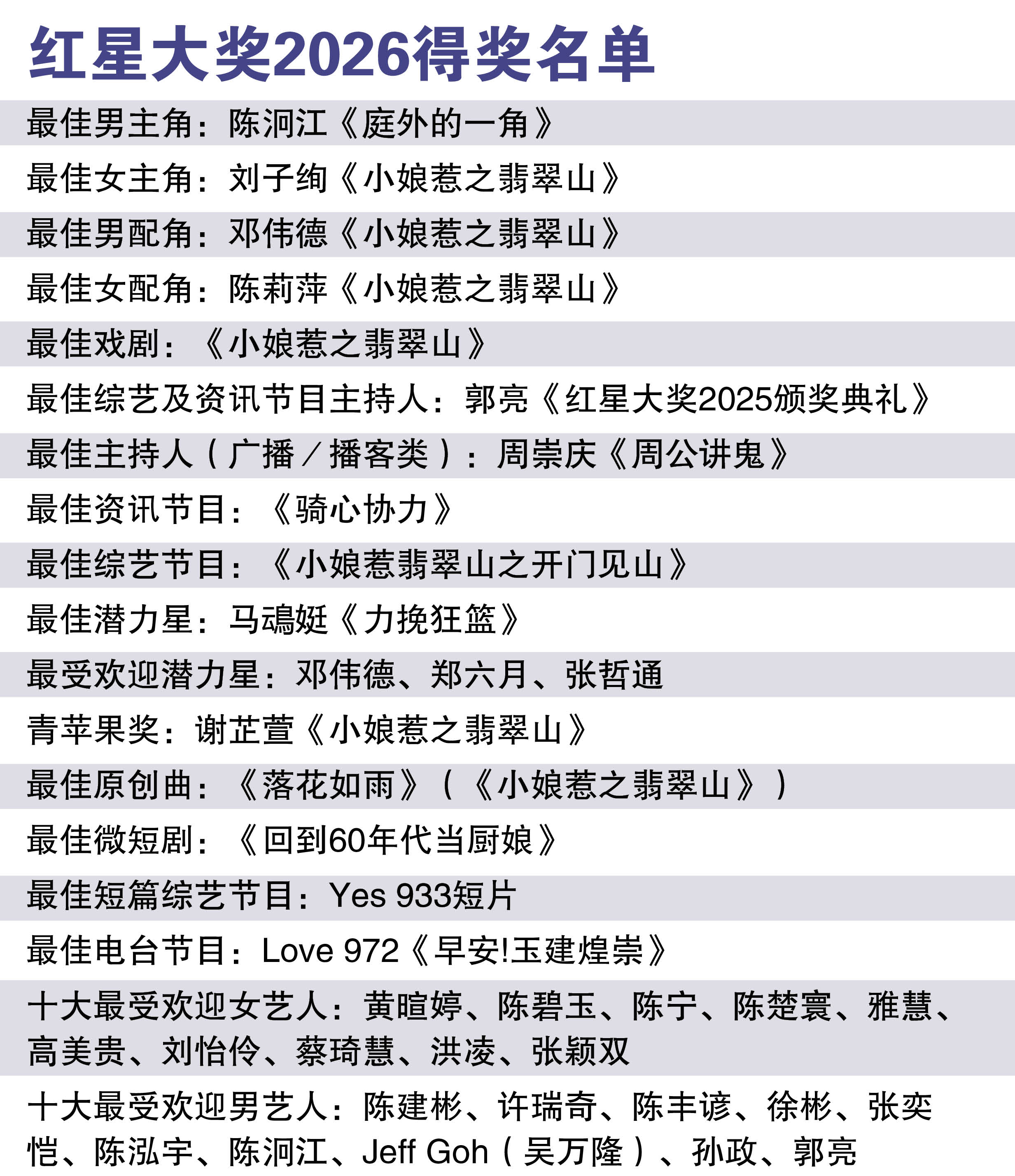 重头剧《翡翠山》成为本届最大赢家,一举横扫最佳女主角(刘子绚)、最佳男配角(邓伟德)、最佳女配角(陈莉萍)及最佳戏剧奖,连衍生综艺《小娘惹翡翠山之开门见山》也拿下最佳综艺节目奖。